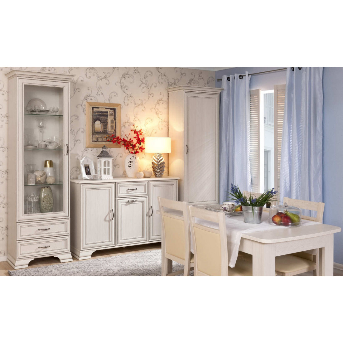 Гостиная Тиффани - это классика, которая всегда остается модной и стильной. Сочетание светлого оттенка с древесной структурой, нежных фасадов, обрамленных изящными планками с патиной и качественных металлических ручек создадут атмосферу тепла и уюта, а возможность использования подсветки делает эту коллекцию особенно привлекательной. Основное достоинство TIFFANY - эстетическая функциональность, которая роскошно дополнит различный по назначению интерьер.